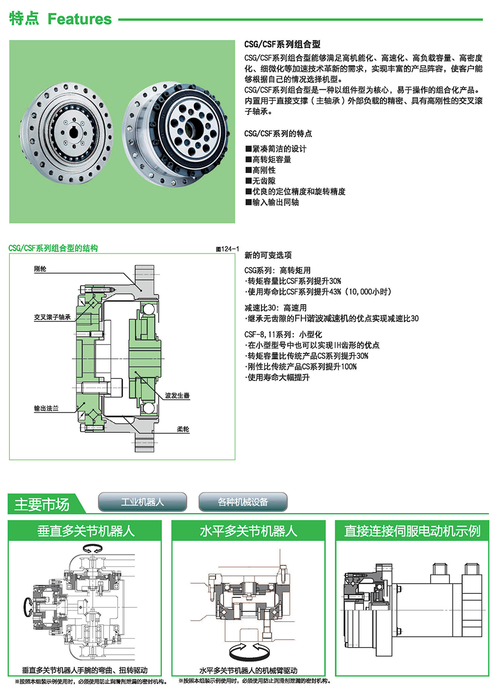 CSG/CSF系列組合型能夠滿足高機(jī)能化、高速化、高負(fù)載容量、高密度化、細(xì)微化等加速技術(shù)革新的需求,實(shí)現(xiàn)豐富的產(chǎn)品陣容,使客戶能夠根據(jù)自己的情況選擇機(jī)型。