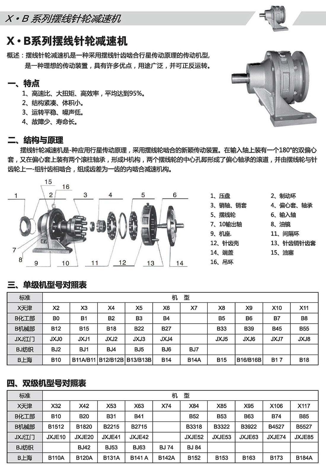擺線針輪減速機是種應用行星傳動原理,采用擺線輪嚙合的新穎傳動裝置。在輸入軸上裝有一個180°的雙偏心套,又在偏心套上裝有兩個滾柱軸承,形成H機構,兩個擺線輪的中心孔即形成了偏心軸承的滾道,并由擺線輪與針齒輪上- --組針齒相嚙合,組成齒差為- -齒的內嚙合減速機構。