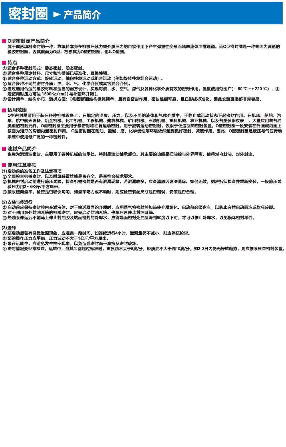 通過選用合適的橡膠材料和適當?shù)呐浞皆O計,實現(xiàn)對油、水、空氣、煤氣及各種化學介質有效的密封作用。溫度使用范圍廣(- 60*C~+220°C) ,固定使用時壓力可達1500Kg/cm2(與補強環(huán)并用)。