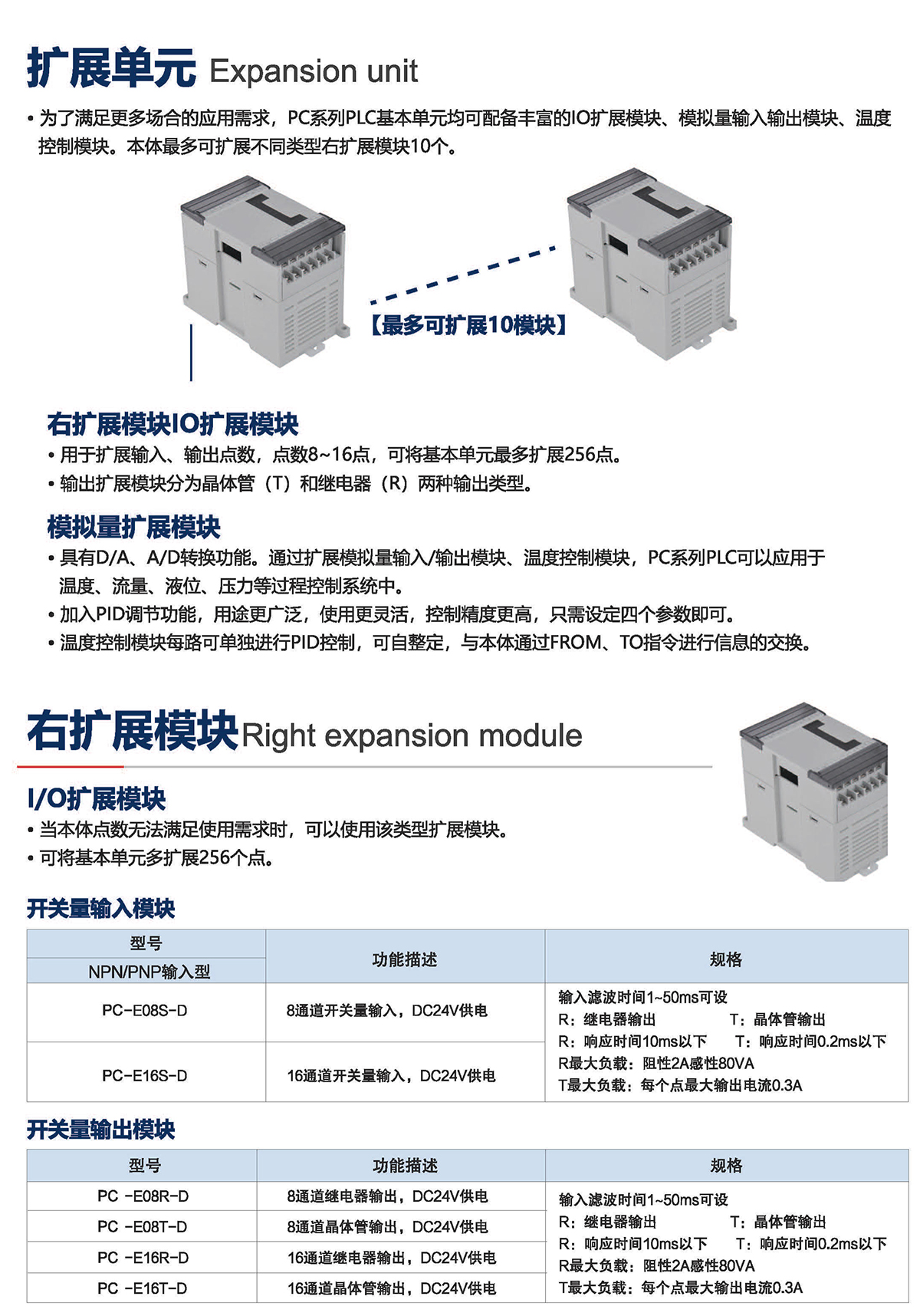 為了滿足更多場合的應用需求, PC系列PLC基本單元均可配備豐富的IO擴展模塊、模擬量輸入輸出模塊、溫度 控制模塊。本體可擴展不同類型右擴展模塊10個。