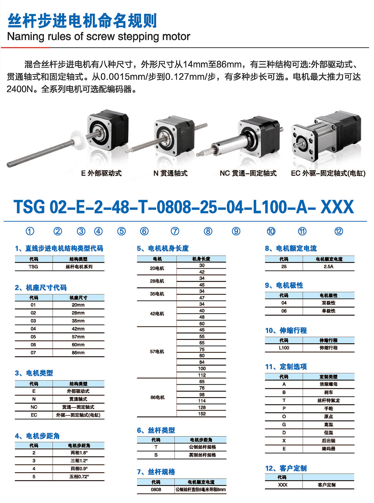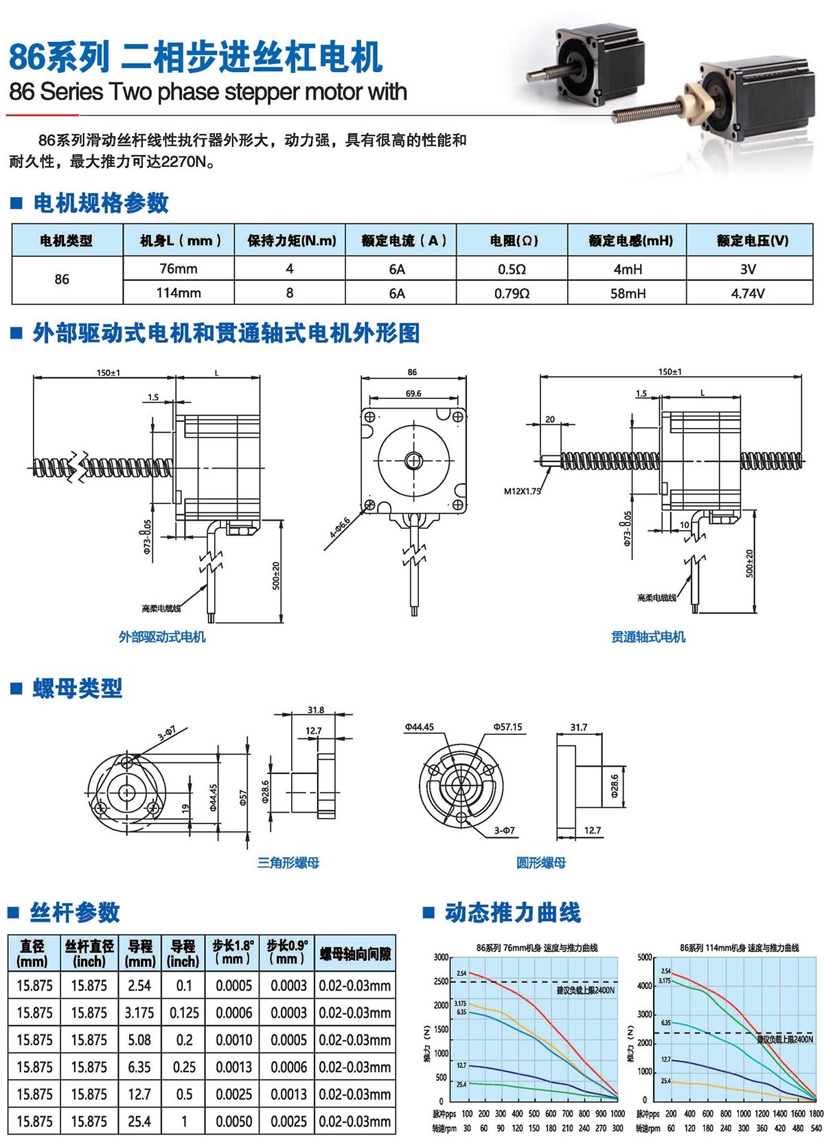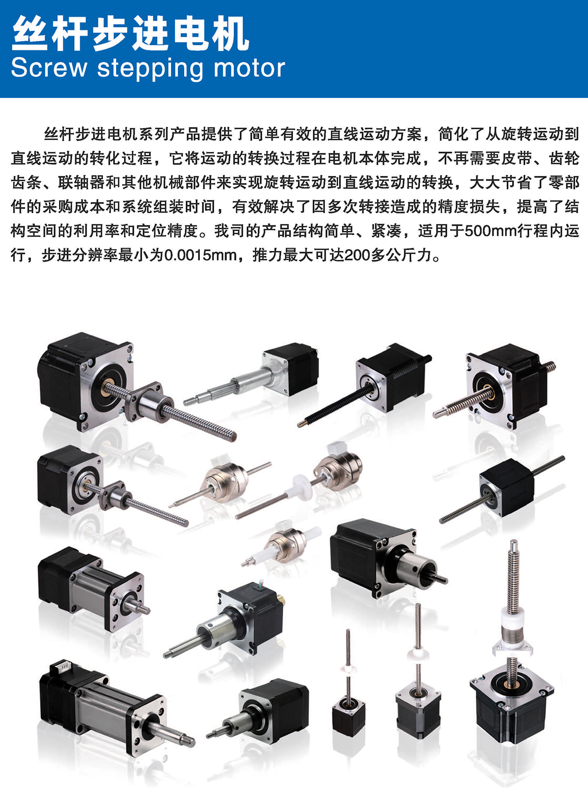 絲桿步進電機系列產(chǎn)品提供了簡單有效的直線運動方案,簡化了從旋轉(zhuǎn)運動到 直線運動的轉(zhuǎn)化過程,它將運動的轉(zhuǎn)換過程在電機本體完成,不再需要皮帶、齒輪 齒條、聯(lián)軸器和其他機械部件來實現(xiàn)旋轉(zhuǎn)運動到直線運動的轉(zhuǎn)換,大大節(jié)省了零部 件的采購成本和系統(tǒng)組裝時間,有效解決了因多次轉(zhuǎn)接造成的精度損失,提高 了結(jié) 構(gòu)空間的利用率和定位精度。我司的產(chǎn)品結(jié)構(gòu)簡單、緊湊,適用于500mm行程內(nèi)運 行,步進分辨率小為0.0015mm,推力可達200多公斤力。