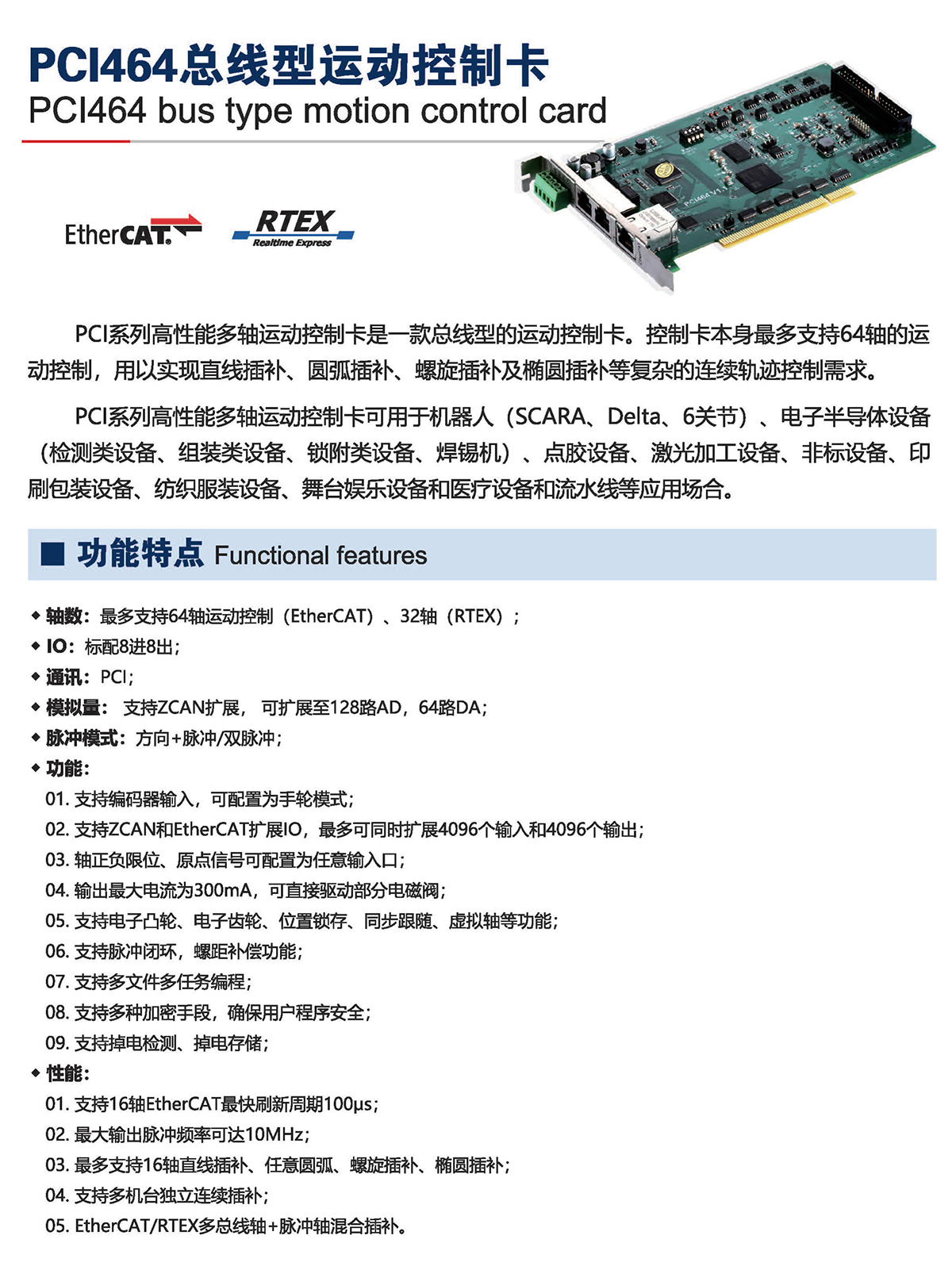 PCI系列高性能多軸運動控制卡可用于機器人( SCARA、Delta. 6關節(jié))、電子半導體設備(檢測類設備、組裝類設備、鎖附類設備、焊錫機)、點膠設備、激光加工設備、非標設備、印刷包裝設備、紡織服裝設備、舞臺娛樂設備和醫(yī)療設備和流水線等應用場合。